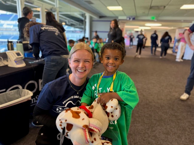 Every year, Dr. Krendl and his wife volunteer with TeamSmile, a national nonprofit that partners with professional sports teams to provide free dental care for underserved kids. The events are held at major stadiums around the country, so the children get their teeth taken care of and have a genuinely fun day while they're at it. Members of the Colorado Dental Arts team, including dental assistant Hannah, have volunteered alongside them.